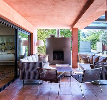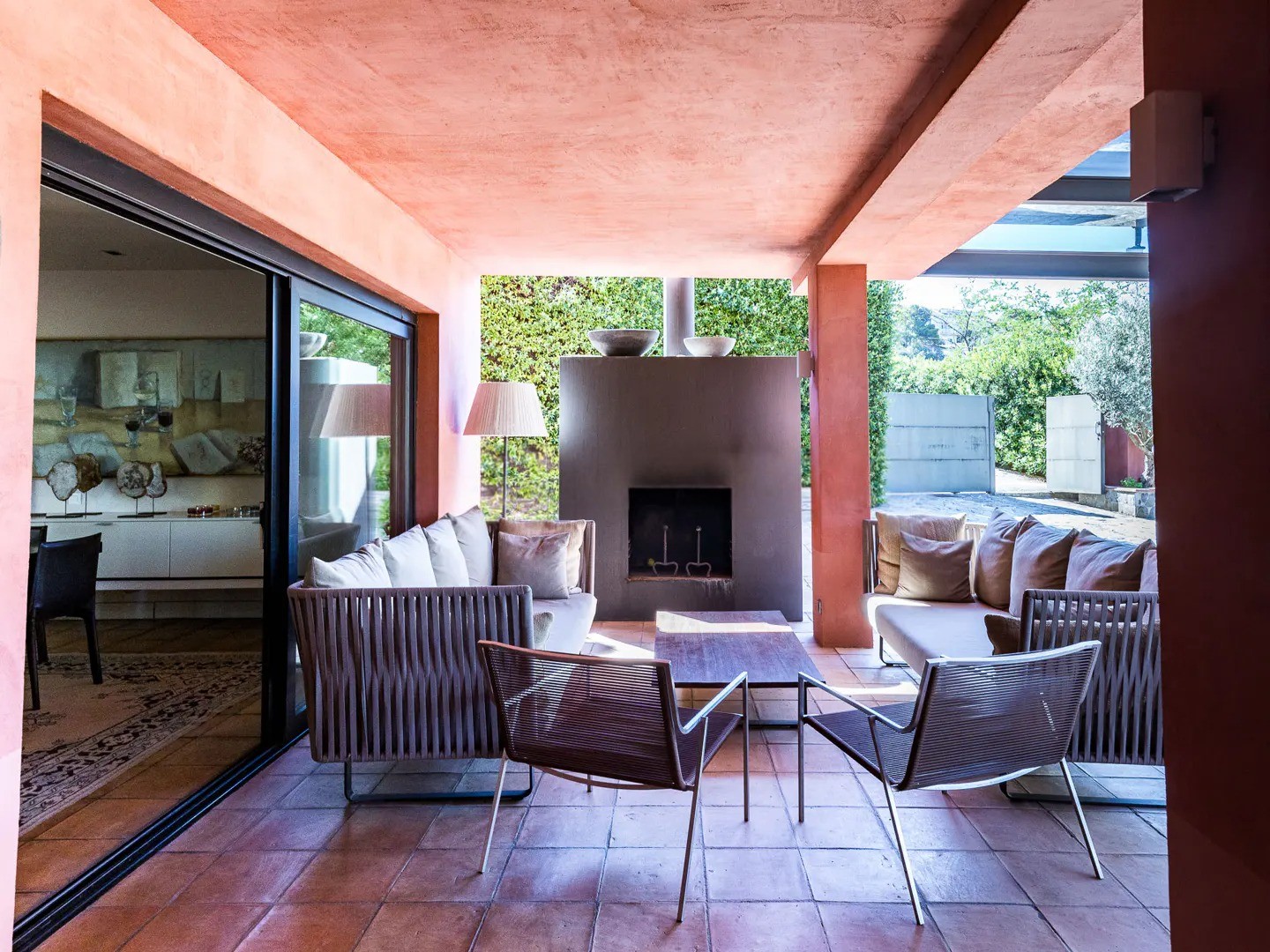 Spacious terraces and a porch with an outdoor fireplace.
